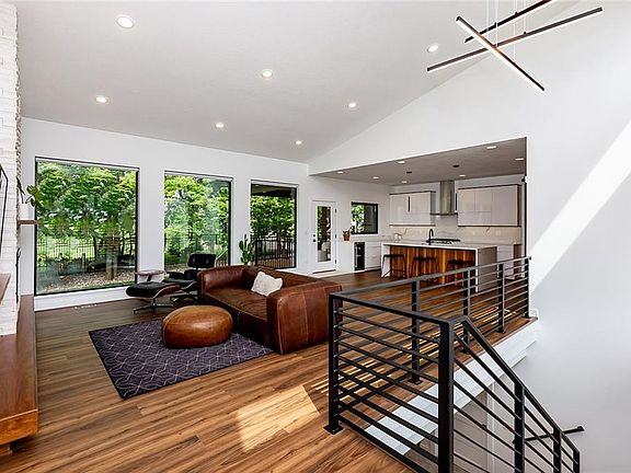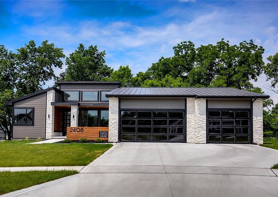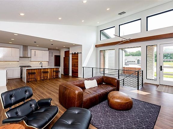 Custom built modern ranch by Wilmore Custom Homes! This home features 3 beds on the main, vaulted great room to 18', commercial raised-seam metal roof, Pella Impervia windows (LOW E), Omega cabinets on the main level with high gloss white and walnut, all LVP on the main level, floating cabinets in the bathrooms with LED lighting, huge tiled master shower, and upgraded closet systems. The daylight lower level is finished with a custom metal railing, 2 more bedrooms, 3rd bathroom, larger living space, wet bar with custom wood wall w/ hidden door to the golf/ workout room (can be converted to movie theater/ workout). Other features include irrigation, 6' wrought iron fence, solid core doors, quartz waterfall island and backsplash, drawer storage in kitchen, and under cab lighting. The oversized garage (3.5 stalls) includes oversized doors, floor drain, hot and cold water and is wired for a mini split. Vaulted great room to 18' the rest of this home is 9'.