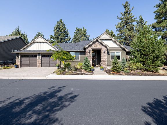 New Price Tune-Up! Just steps from the golf course, this stunning single-level Pahlisch home combines timeless craftsmanship w/ modern design in one of Bend's most desirable settings. A welcoming brick archway opens into a bright great room filled w/ soaring ceilings, custom built-ins, & a stacked-stone fireplace. The chef's kitchen is the heart of the home— a 6-burner range, quartz island w/ seating, stylish backsplash, & walk-in pantry. The primary suite offers true retreat w/ a coffered ceiling, soaking tub, tiled shower, dual vanity, & walk-in closet. Thoughtful separation places guest bedrooms & bath on their own wing for privacy. Throughout, enjoy engineered hardwoods, cozy dining, an oversized laundry w/ office nook/storage, plus a 3-car tandem garage. Outdoors, relax on the covered patio w/ privacy enhanced by HOA common area. With low-maintenance landscaping, nearby trails, & quick access to Deschutes River, & downtown Bend—you'll love every detail of this move-in ready gem.