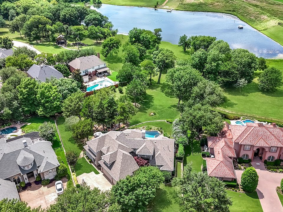 UNIQUE opportunity to live lakefront in McKinney! This gem of a home is located in a gated community with arguably one of the best views in McKinney. This oasis in the city boasts an infinity pool, covered grill and bar area, fire pit, and outdoor living space on an oversized heavily treed lot with sweeping views of Hardin Lake. Custom touches throughout the home include: large open living spaces, a double sided fireplace between the study (or second living area) and main living area, refinished hardwoods, shutters, and a chef's kitchen with double ovens, gas cooktop, built-in sub zero fridge and island. The primary bedroom is massive with plenty of room for a sitting area, a fireplace, ensuite bath, and walk in closet. While there is another bedroom downstairs, there are 2 bedrooms upstairs, with 2.5 baths, a media room, exercise room and study. A large upper balcony with a spiral staircase down to the pool area provides more entertaining space and additional views of the lake. Do not miss the chance to tour this home and make it your own! It is a