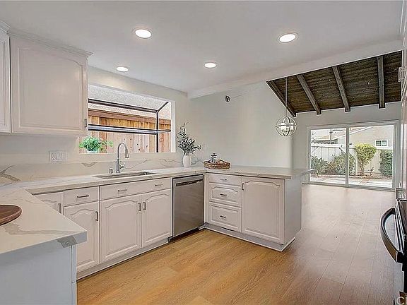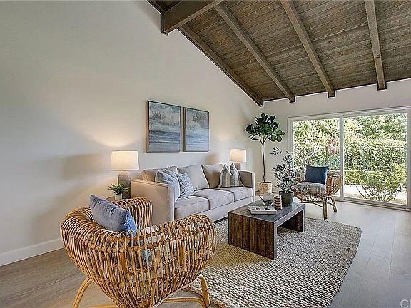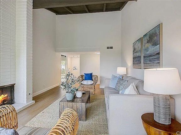 Super-Cute Single Family Home with 2 Car Garage and Ocean View...~1 mile to the beach. Enter into your front courtyard area where you will find the front door that leads you into the foyer. The cozy living area features high beamed ceilings, a gas fireplace, and large sliding glass doors that allow an abundance of natural light to illuminate the floorplan. The formal dining room features a stunning light fixture and views of the yard and the ocean. The remodeled kitchen features recessed lighting, gorgeous countertops, white cabinets, an eat-in bar, and updated flooring. There is an additional living area that opens to the kitchen and a slider glass door that leads you back to the front porch. The primary suite is spacious and has a private slider glass door to the backyard. The en-suite bathroom features updated counters, two mirrored vanities, shower in tub, and mirrored closet. The three secondary bedrooms are a generous size with updated carpet and bathrooms and views to the courtyard. Home also features in-unit laundry. The backyard is perfect for outdoor entertaining with slider glass doors back into the home. There is a grassy yard and a patio with ocean views! Gated Community offers its residents pool, spa, and tennis courts. 6 - 8 Month Lease through May 30, 2025. No Smoking. Small dog may be approved with $600 deposit. Water is paid by homeowners association. Tenant is responsible for Trash, Electricity and Gas. Gated community, must park in garage or immediately in front of the garage, do not block neighbors.