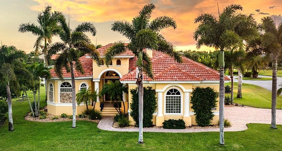 Prepare to be amazed from the moment you arrive at this exquisite, custom-built Mediterranean-style home. Located on a beautifully landscaped .45-acre lot overlooking Osprey Lake, this one-owner masterpiece exudes style and sophistication, showcasing architectural beauty at every turn. The paver driveway leads to a welcoming front entrance with tiled steps, French leaded glass doors, and an arched window, inviting you into a home that is as stunning as it is functional. Upon entering, you’ll find diagonally set tile floors accented by a striking medallion insert, while the high ceilings and abundant natural light add to the home's luxurious feel. The great room, with its double tray ceiling, uplighting, and crown molding, opens to a screened lanai through a 90-degree sliding glass door, seamlessly blending indoor and outdoor living spaces. Bose surround sound speakers are add to a rich, immersive experience. The custom-built study features chair rail, hand-scraped wood floors and a grand arched door and offers a quiet space for work or reflection. The gourmet kitchen with warm wood cabinetry, granite surfaces, stainless steel KitchenAid appliances and a deep pantry is both beautiful and functional. A breakfast bar and dining area overlook the lanai, making it the perfect spot for both meals and entertaining. The primary suite is a luxurious retreat, offering tray ceilings, walk-in closets, and access to the pool area. The en-suite bath is a spa-like haven, complete with high vanities topped with granite, a whirlpool tub, and a custom tile shower with 3 showerheads and is wheelchair accessible. The split bedroom floor plan ensures privacy for you and your guests. The 2 guest bedrooms feature tall, deep closets and one room has sliding glass doors to the pool. The large side-entry 3-car garage is 33 feet wide and 26 feet deep, with high ceilings and built-in storage. The outdoor space is an oasis, designed for relaxation and entertainment. The well-manicured lawn, lined with majestic palms, includes a fire pit, horseshoe pit, and an arbor framed with bougainvillea. Mango, coconut, avocado trees along with a Royal Poinciana and a Hong Kong orchid, add to the tropical feel. The property features an irrigation well, ensuring lush landscaping year-round. A greenbelt behind the house affords a tranquil lake view and the neighboring house is built on 2 lots so there is plenty space. The heated pool and paver deck is perfect for both entertaining and unwinding. An outdoor wet bar and mini-refrig are tucked under a custom arch and a pool bath and outdoor shower enhance convenience. Whether you're relaxing poolside, enjoying the serene lake views, or hosting friends, the space feels like a private getaway. Additional highlights include impact-resistant windows and doors, 8-foot doors and fresh exterior paint. This home’s thoughtful design and stunning surroundings make it a rare find, blending luxury, comfort, and practicality in one exceptional package. Burnt Store Lakes is a beautiful Deed Restricted Community. Residents enjoy a park with picnic area and a kayak ramp that accesses Charlotte Harbor where you’ll find an array of wildlife such as manatees, porpoises, sea turtles and game fish. Next door at Burnt Store Marina you’ll find full-service marina, restaurants, golf, fitness and boating options. It’s just a short drive to downtown Punta Gorda, one of Florida’s best small towns, with plenty of restaurants and town activities to enjoy.