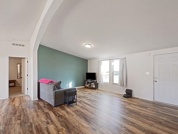 Step inside to find new vinyl plank flooring and a spacious open-concept layout featuring a bright living room with vaulted ceilings, a modern kitchen with stainless steel appliances, a large island with seating, and a dedicated dining area with sliding doors leading to the fenced backyard—perfect for entertaining or relaxing outdoors.