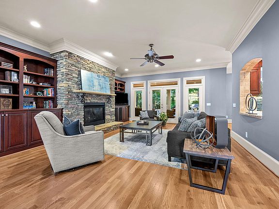 Stunning Custom Executive Home on Private Cul-de-Sac. Welcome to this beautifully crafted executive residence, tucked away on a quiet cul-de-sac offering both privacy and elegance. Step into a dramatic two-story foyer that opens to a spacious great room with a cozy fireplace — perfect for relaxing or entertaining. The main level boasts a true gourmet kitchen with top-tier finishes, a formal dining room with coffered ceiling, a private study with French doors, and a guest suite complete with ensuite bath. Rich hardwood floors and stately moulding details throughout elevate the home's timeless sophistication. Upstairs, the expansive primary suite is a true retreat featuring a separate sitting area, a spa-like bathroom, and an absolutely massive walk-in closet/dressing room. Two additional bedrooms and a large bonus room provide plenty of space for family or guests. Step outside and enjoy the exceptional outdoor living space, complete with a spacious rear porch, covered and uncovered patio areas, and a built-in fire pit — ideal for year-round entertaining. Additional highlights include a 3-car garage and countless custom upgrades throughout. This home offers the perfect blend of luxury, comfort, and thoughtful design.