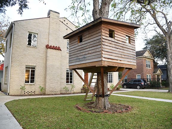 An architect-designed real treehouse is attached to one of the two heritage pecan trees in the front yard. (You can now relive childhood memories in this playful structure)