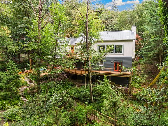 This well-designed home has 2 ensuite BDRMS, powder RM, + a separate guest suite great for short term rental. Primary BDRM w LG ensuite, cherry cabs, accents, walk-in closet. 2nd ensuite BDRM, w queen size murphy. BDRMs w built-ins, decks overlook woodlands. Under garage, guest suite is permitted as short term stay rental. Separate from house w private entry. Great flex space [588+/-sf] w BTHRM/shower, sink, micro, +fridge. With many of PDX's attractions, makes for a great launch pad to explore our city. Previously rented for $100-$125/night (far less than market suggested) avg 1-3 night stays. Not currently rented. Nestled in prime area of West Hills, EZ freeway connections to HWY 26, HWY 217, and I-5. Just mins to St. Vincent's, Downtown, PDX attractions like Oregon Zoo, Hoyt Arboretum, World Forestry, & Portland Japanese Garden. Situated on private street, in un-incorporated City of Portland, Multnomah Cnty. A modern-day bungalow, admire the blend of exterior materials: concrete, Corten steel, and cedar. New metal roof, just 2yrs ago! Sleek lines & textures set this home apart. Pull into the drive, let this impressive footprint begin to unfold. Impressive in every way. Custom built in '95, NOW, 1st time on market! Crafted w comfort in mind, beginning w the Hydronic radiant floor heating system. Maximizing the views of natural lush landscape from the expansive wall of windows. The main floor is genuinely an entertainer's delight. Kitchen offers LG solid surfaces, induction, combo oven/micro, ample counter space, eat bar, great for gathering & hanging w host. Open concept from kitchen, dining, + LVG RM w cathedral-style vaulted ceiling. Enjoy the wood burning FRPLC w gas starter faced in Corten steel. Large deck for add'l entertaining space, firepit, small bridge over seasonal stream, w more places to enjoy what nature provides. Take delight, sit still, relax & appreciate the natural setting. MAIN HOUSE is 2 BR/2.1 BA, 1,652+/-sf, GUEST SUITE is 1 BR/1BA 588+/-sf.