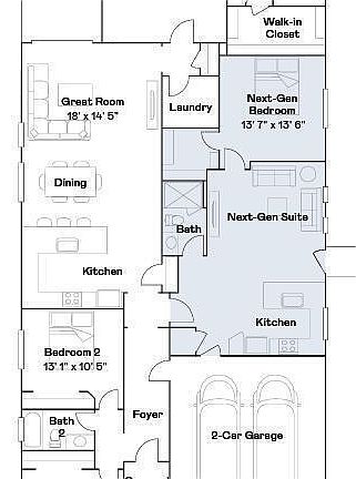 This Next Gen® home features a separate suite ideal for adult residents or long-term guests who desire more independence. The main home showcases a cohesive design with an open floorplan among the kitchen, dining room and Great Room—accessing a covered patio. The cozy owner's suite features toward the back, while two additional bedrooms are near the front. Features include Sonoma Maple Linen (white) cabinets, Quartz countertops, and Super Luxury 7 x 22 plank tile flooring. Below Market Financing Available.