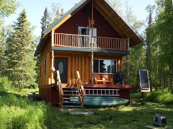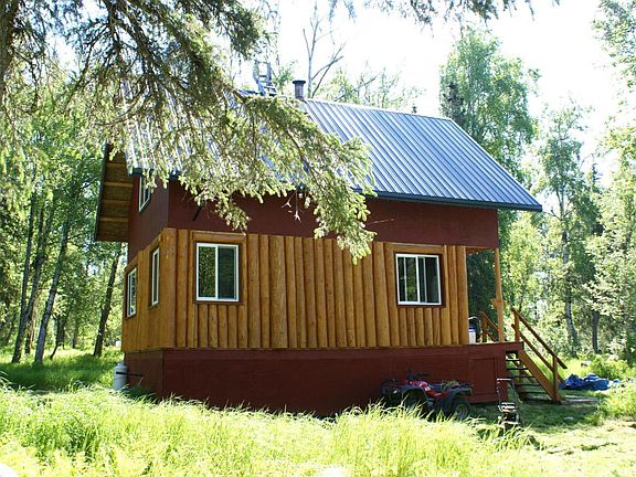 Beautifully handcrafted vertical log cabin on 5 acres shows pride of ownership. 2 bedrooms, open floor plan with nice bright kitchen & living space. In bathroom area there is a composting toilet. Unmaintained summer road access 1/2 mile. Can use a 4-wheel drive truck, ATV, Snowmachine or dog mush with easy access to trails galore. Has a well just hook it up to cabin.