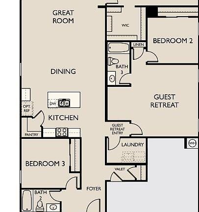 Welcome to your dream home! This floor plan can easily be set up as a next gen suite. This beautiful new construction single-story residence known as our Sunflower plan offers 2,150 square feet of thoughtfully designed living space. Featuring 4 bedrooms, 3 bathrooms, and a versatile guest suite /den, this home provides the perfect blend of comfort and functionality. The split floor plan offers added privacy, with the primary suite thoughtfully separated from the additional bedrooms. The open concept floor plan creates a seamless flow throughout the main living areas, ideal for entertaining and everyday living. Stunning 4-panel sliding glass door for that indoor-outdoor lifestyle! This home features the beautiful minimalist collection palette featuring 42-inch upper light grey cabinets, quartz countertops, single basin undermounted sink, and cohesive tile backsplash. 2411 The wood-look tile flooring throughout the main areas adds warmth and style, while the cozy carpeted bedrooms ensure a soft and inviting retreat. The home also includes Stainless Steel side by side refrigerator with ice maker, washer, dryer, and 2" faux blinds. This home is located near the walking trail and community park.