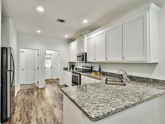Ready for immediate move in! Beautiful 3 bedroom, 2 bath split plan duplex features gorgeous amenities throughout. Gourmet kitchen with granite countertops, tons of countertop and cabinet space, stainless appliances, refrigerator included and pantry. Primary bedroom has a large walk in closet, large ensuite with granite countertops, double sinks and plenty of storage. Secondary bedrooms share a hall bathroom with ample storage space. Laundry room inside home with electric washer and dryer connections. Easy care vinyl flooring and carpet in bedrooms. Covered patio in back and large private fenced yard. $150 mandatory monthly maintenance fee. includes water, trash and yard mowing. Sq Ft is per the builder. Check this one out today!