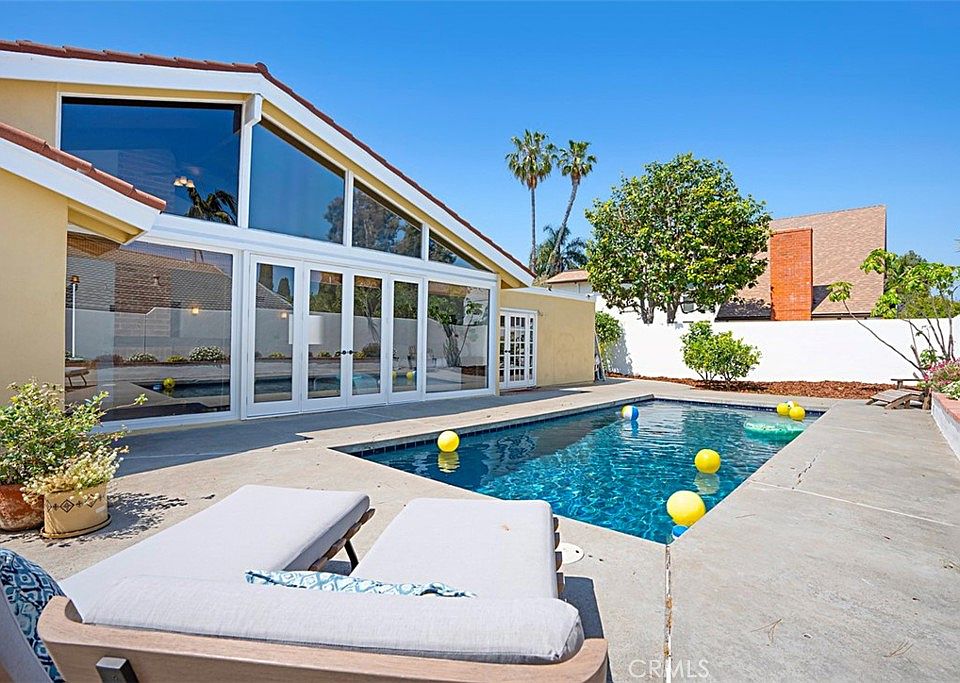 The POOL is OPEN!! Opportunity awaits!! 4 Bedroom and 2 FULL bath POOL home with large usable backyard. This ONE level home features soaring ceilings with a beautiful glass wall looking out to the newly refinished pool. Entering from the quiet cul-de-sac the mid-century 'Ben Deane' home features open space and opportunity to grow. Fresh paint inside and outside. Upgraded kitchen with cathedral ceiling, granite counters and custom cabinets. Stainless steel Chefs range, refrigerator and dish washer. Unique design feature is a gas cast iron stove in the dining area to warm you on cool nights. Three more bedrooms with a refreshed bathroom with reglazed tub and new vanity. Main bedroom features double door walk out to the pool, freshly remodeled bath with large walk-in shower. Outside you will find a newly replastered and tiled shimmering pool in the huge back yard. Plenty of room to add an ADU or pool room. Large patios and planters abound. 2 car garage and 2 car driveway parking. This home is in the Lake Forest Beach and tennis community with sports courts, club house, pools and events each month. A short walk to the popular veteran's park with small lake for evening walks or exercise. Freeway close and a short drive to shopping, restaurants and the Irvine spectrum.
