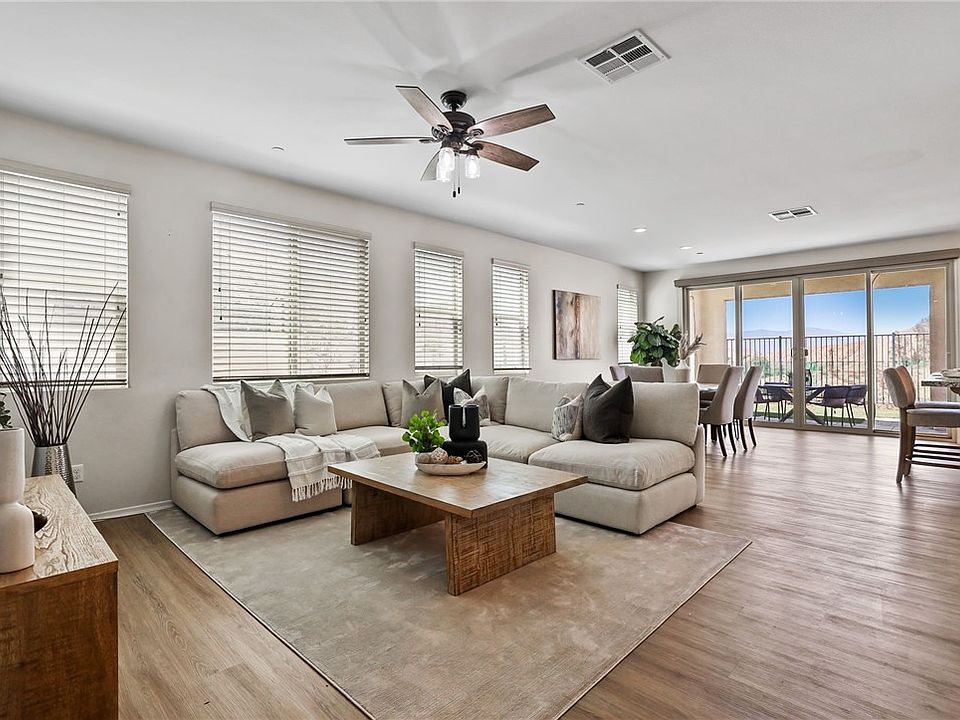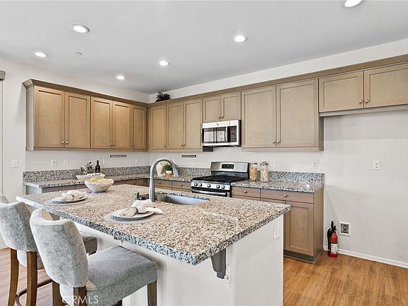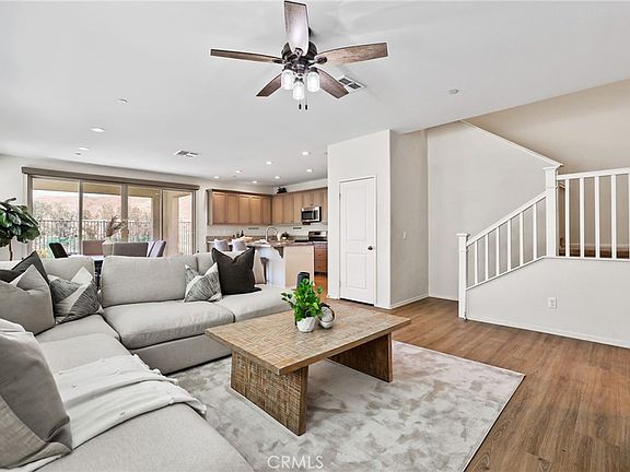 Welcome to 24097 Darmera in Lake Elsinore, offering a spectacular view, a wrap-around yard, tons of privacy, and a serene setting that sets it apart from others in the neighborhood. This popular 4-bedroom, 3-bathroom floorplan expands 2,133 square feet on a generous 4,227 square foot lot. Upon entering, you’ll also find the inviting warmth of wood flooring extending throughout the main level. The open-concept great room is bathed in natural light and enhanced by recessed lighting and a ceiling fan for added comfort. Culinary enthusiasts will appreciate the updated kitchen, featuring stainless steel appliances, elegant granite countertops, and a walk-in pantry for ample storage. The downstairs bedroom is both spacious and functional, complete with a ceiling fan and a walk-in closet. Adjacent, the modern downstairs bathroom showcases stylish contemporary updates with a full bath and a walk-in shower. Upstairs, the primary bedroom serves as a luxurious retreat with generous space and an expansive closet. The adjoining ensuite bathroom is designed for relaxation, featuring a double vanity sink, a soaking tub, and a walk-in shower. Two additional secondary bedrooms are also located upstairs, each well-sized with ceiling fans and abundant natural light. This home seamlessly blends modern updates with inviting living spaces, making it an ideal choice for comfortable living. Located in the desirable West Ridge community, this residence offers an exceptional Southern California lifestyle in this beautiful gated resort like community with access to pool, playground, sports courts, BBQ area and dog park, all complemented by captivating views. Conveniently situated near the 15 and 215 freeways, as well as shopping and schools, it combines luxury with practicality. Don’t miss your chance to make this home yours!