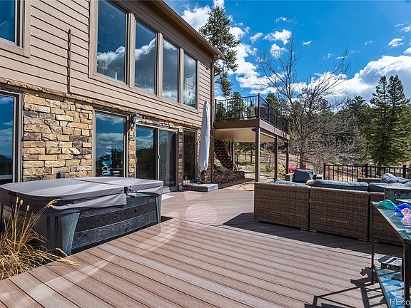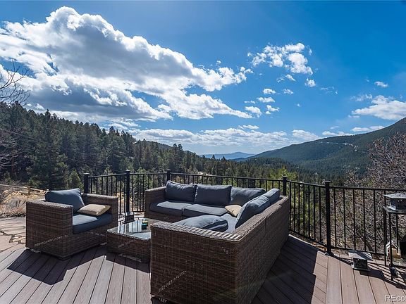 Amazing views from this totally updated Conifer home. This home was designed and remodeled with the mountain views in mind! The updated kitchen hosts stainless appliances, granite counters a dine-at prep island, designer backsplash tiles and a large walk in pantry with Elfa organizers. The kitchen open seamlessly to the dining area and spacious living room anchored with a gas fireplace on thermostat to heat the main level. The living room and dining room are banked by windows that provide extensive views and sunwash the living spaces. Off the dining room you'll find an elevated deck for al fresco dining. Adjacent to the living room is a south facing bedroom and a cozy north facing bedroom that bath can share the full bath resting between the two. The second level features a large primary suite with killer valley views, vaulted ceilings, and a 5 piece bath with a steam shower! Multiple skylights throughout the home provide bright airy lighting all day long. You will love the lower walk out level. It offers a spacious family room , non conforming bedroom , bath and huge office with floor to ceiling windows with views of Foxton Valley. The family room opens to a large deck with a new hot tub and leads to 2 other out seating patio areas. The yard has recently been enclosed with new fencing ($20,000) to provide a secure private area and allow for terrific gardening. This home is an entertainers dream with multiple outdoor living spaces to use and enjoy. The home has a large 2 car attached garage a new shed with electric service, fresh paint, new carpet, refinished wood floors and upgraded Anderson windows for heat efficiency. Located at the end of a quiet drive, just 8 minute from downtown Conifer - this home provides peaceful mountain living at it best.