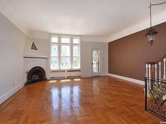 Emanating classic early 20th century vibes, the sundrenched interior dazzles with an openly flowing traditional floorplan, beautiful parquet flooring, stunning original stained-glass windows, high ceilings, and an expansive living room with a romantic faux fireplace. Designed for easy entertaining, the updated eat-in kitchen features gleaming granite countertops with a matching backsplash, a stainless-steel gas range/oven, maple cabinetry, recessed lighting, a breakfast nook with a Tiffany-inspired light fixture, pantry, and an adjoining formal dining room with wall sconces. Entertain guests outdoors or dine al fresco in the fully enclosed backyard, which has a small porch and a lovely greenspace. Three bedrooms are generously sized with dedicated closets, while the full bathroom dons a vintage art-deco appearance with colorful tilework. Catering to modern flex space needs, the finished basement includes a bathroom and a large recreation room with a well-appointed faux fireplace.