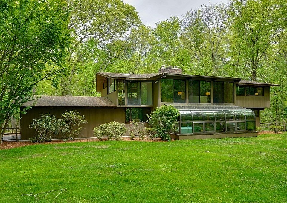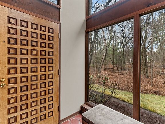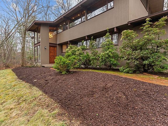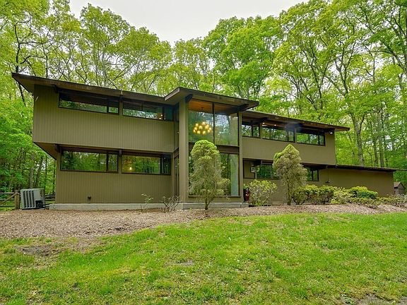 Welcome to this lovely Mid Century Modern Deck house nestled on almost 5 acres of land in wonderful location! Step into the soaring 2 story foyer w/floating staircase & open floor plan throughout both levels! Walls of windows throughout bringing the outdoors in! Main floor living has beamed, wood cathedral ceilings throughout & hardwood flrs in most rooms! Huge fireplaced living rm w/wall of sliders! Gorgeous custom maple kit w/Quatrz counters, huge center island w/granite counter, stainless steel appliances & skylight! Lg dining rm! Den or office w/skylight! Lg Primary w/walls of windows & lg closet! 3 additional bdrms all w/lg closets! 2 updated full bths! Main level bth has radiant heat, oversized tiled shower w/glass door & skylight! Lower level has huge fireplaced family rm opening to lovely heated sunrm w/glass walls & ceiling! Great home office! Oversized 2 car gar! Private lot w/patio & partially fenced yard! Great location, close to all major rts, schools, shops & restaurants!