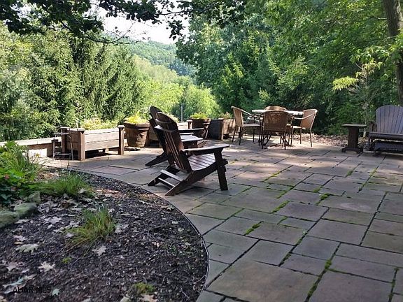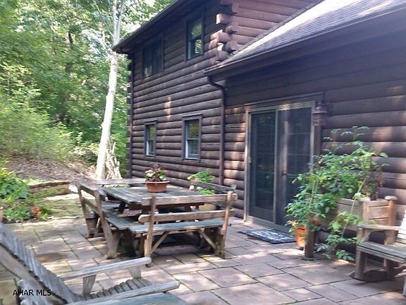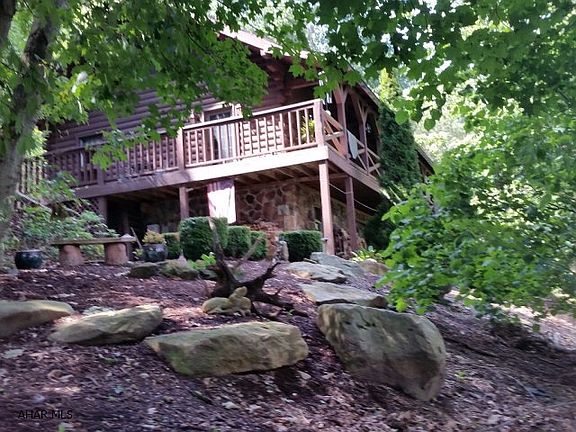 Quality 3-bedroom 2-bath home with tongue & groove oak flooring, Kitchen with island & oak cabinets & ceramic tile floors, garden tub & separate shower in master bath, rustic 1.47-acre setting, 2 patios, wraparound porch & deck, fire ring & built-in benches, walkout fully finished basement w/ceramic tile & carpet with 2nd Bath, 2nd Kitchen with sink, cupboards & Laundry Area, Family Room & bar, concrete drive, 2-car stone-faced detached garage, French doors from Dining Room, vaulted ceilings & skylights and catwalk between the 2 upstairs bedrooms add to the charm of this log home. J-353