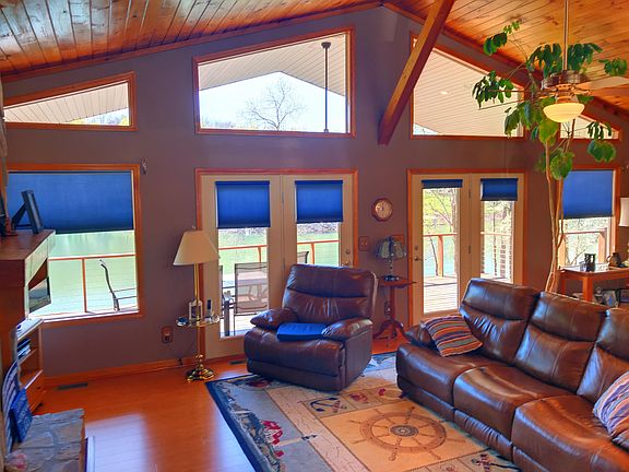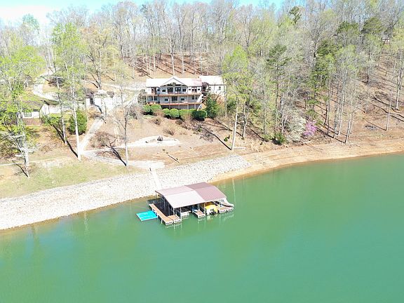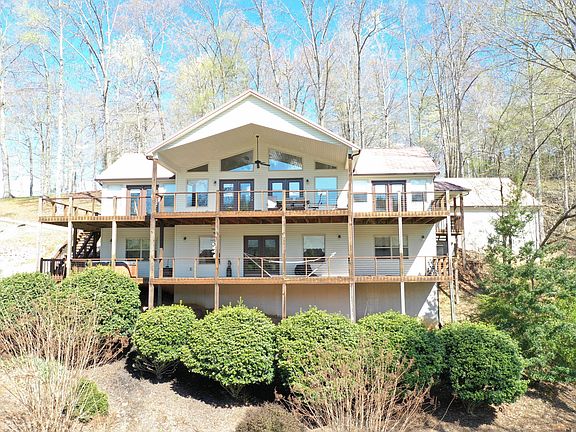 This is the perfect vacation or permanent home on a great lot with easy access to lake and at the mouth of a perfect cove. Enter into the great room, kitchen & dining room. Master suite and 2nd bedroom, bath and laundry. Lots of windows and walk out deck. Down stairs is large family room, 3 bedrooms and 2 baths with storage and wet bar, large walk out deck to path to Fire pit and over sized 2 bay dock with swim platform