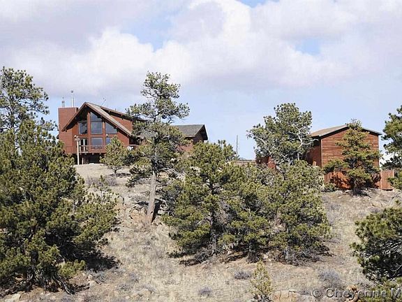 White cedar tongue-and-groove construction with amazing wall windows overlooking Vedauwoo! This mountain home has wonderful amenities. Antler chandelier, rock wall behind gas stove, walk-out basement with wet bar/mini kitchen, updated kitchen and baths, 2 jetted tubs, fabulous master suite on second level. It even has a buffalo statue in the drive. Rocks, trees, and a fishing pond in the subdivision. Septic is sized for 3 bedrooms / 6 people.