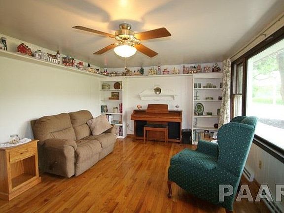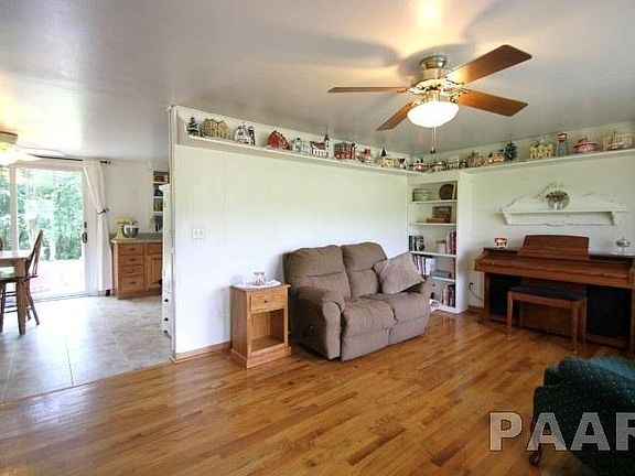 Great country setting, sprawling ranch home with oversized 2+ car garage, insulated. 3-4 bedrooms, 2 full baths, updated kitchen, newer appliances, flooring, roof in 2014, and some newer windows. Patio and wooded spacious yard with additional side lot great for gardening, parking or parties. Large living room and sunken family room with new laminate. Hardwood floors in living room and master bedroom. Full basement has tornado shelter with full bath, large open rec room and additional den/spare room. Germantown Hills and Metamora schools, East Peoria address, Woodford county.