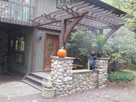 STONE AND WOOD WITH A GORGEOUS PERGALA ENTRANCE, this warm and inviting home is for all seasons! Imagine enjoying nature's sounds, sitting high in the trees, on the screened porch in summer, gathering around the wood stove enjoying hot cocoa in winter, having your coffee at the breakfast bar viewing the fall foliage, or just taking the chill off with the fireplace on a cool spring night! Well appointed home has lots of character with wood cathedrals, river stone frplace, gorgeous wood doors throughout, and the added touches of custom builtin drawers in the master. Could be vacation or full time living, but a ''must see'' if you appreciate good craftsmanship! 3 bedrms, 2 bths, FULL DRY BASEMENT FOR STORAGE, all on an acre of peace and quiet in the Hamlet! BACKS UP TO GAMELANDS! See photos!