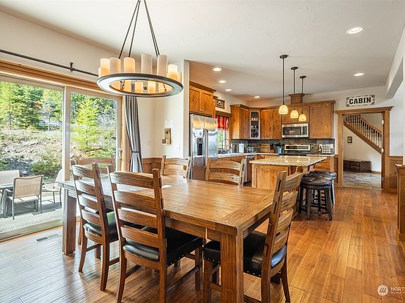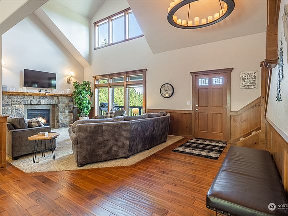 Serene mountain view lodge escape on 3 acres with majestic vistas throughout. Bordered by Wenatchee nat'l forest & a seasonal creek, this Granite Creek residence offers an enviable lifestyle. 2-story foyer entry leads to open concept living/dining/kitchen with knotty alder cabinetry, granite countertops, hardwood floors, & custom wainscoting. Grand staircase to guest wing (2 beds + 1 bath) & lounge space. Main floor primary suite features walk-in closet & bath w/ heated floors & dual shower-heads. Glass sliders to backyard & large view patio with spa. Addt'l foyer/mudroom w/ access to 2nd upstairs suite or home theatre. Fully-equipped oversized garage game zone w/heater offers pull through vehicle access. Whole-home generator (2023).