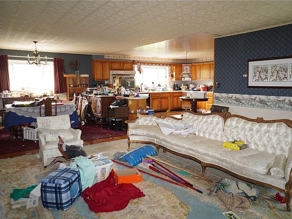 Large Ranch house with open concept LR,DR & Kitchen house in need of major TLC with 3 Acres - 3 Large Bedrooms -Huge Main floor Bathroom. Massive downstairs game room with additional kitchen, 3rd bedroom & Full bath- with access to exterior ( could be rented out) Massive Cement Parking pad room for 10 + cars in rear of building and attached 2 car garage. Garage top deck accessible from LR. 2 Parcel sale - House is AS IS-