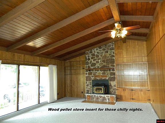 Get that rustic feeling in this spacious 2 BR, 2 BA home. Beautiful wood cathedral ceiling in great room & dining area, windows galore in living rm & family rm/sun room, new flooring, heat pump & several new windows. Abundant storage space, cedar lined closets, central vac, stone fireplace w/pellet insert, wood stove, garage/carport plus 15x10 storage room/workshop. Flagstone patio w/covered area, extra 150x70 level lot included. Winter views of Bull Shoals Lake & walk to lake access.