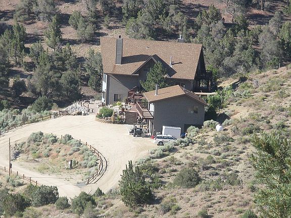 Three floors, vaulted ceilings with rough sawn open beams, 2200 sq ft of redwood decking, natural EZ landscaping with 2 sitting patios, a replica mine shaft entrance (for storing firewood) with short train track for an Ore Cart, a 10 ft waterfall and pond, decorative brick borders with plants, trees and a 6 zone irrigation system, extra large two car garage with open area between the bays, and a two (2) bedroom bungalow/guest-house above the garage. The BUNGALOW features a full kitchen, living room with rock hearth and wood-stove, French-doors accessing the view deck, rough sawn open beam vaulted ceiling, a full bathroom and laundry room, 8ft pony walls between master bedroom and living room, a partial wrap-around deck with spectacular views and private back yard behind the bungalow. Natural Landscaping with accents of mining include a replica mine shaft with railroad tracks, sitting patios with mining antiques, a large waterfall and lots of landscape lighting in hanging vintage lanterns. Plus there's a play area, RV Parking with hook-ups, guest and equipment parking, a dog run with insulated dog houses, lawn, water and heat, under deck storage, rain and snow abatement and retention system, storage sheds with power, landscape lighting including lights for all stairs, walkways, decks and up-lighting of the main house and the entire driveway by antique lanterns, an illuminated seasonal display stage along the lower driveway and street side display stage next to lamp post, both with dedicated power and visible from the street, . . . all behind a power security gate, perched high above the world. The VIEWS are simply AWESOME!