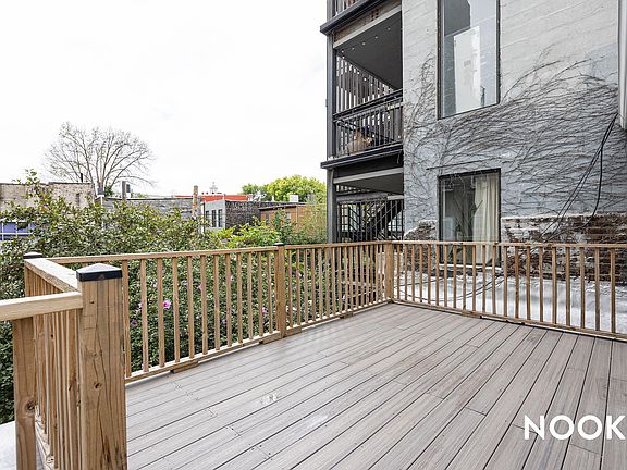 Located on the second floor of a 2-story building just a few short blocks from the Grand and Graham L stations. The open concept living room/kitchen is swimming in natural light with high ceilings, a lofted storage area, and washer-dryer combo. It features not one but two full bathrooms-- both with windows-- and a private wraparound balcony. The main bedroom is in the rear away from street noise, and the middle room has three skylights.