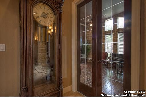 Hill Country 1.5 Story Home. Formal dining with tray ceiling ornamental iron artwork and wood floor. Triangular island kitchen with granite counter, tiled backsplash and floor, under/over cabinet lighting, over range pasta faucet, and walk-in pantry. Corner gas fireplace in family room with 20' vaulted ceiling . Master bath with separate vanities, separate shower and jacuzzi tub. Upstairs game room with wet bar, mini-fridge office loft, bedroom, and full bath. Study with built-in desk/armoire. Covered patio