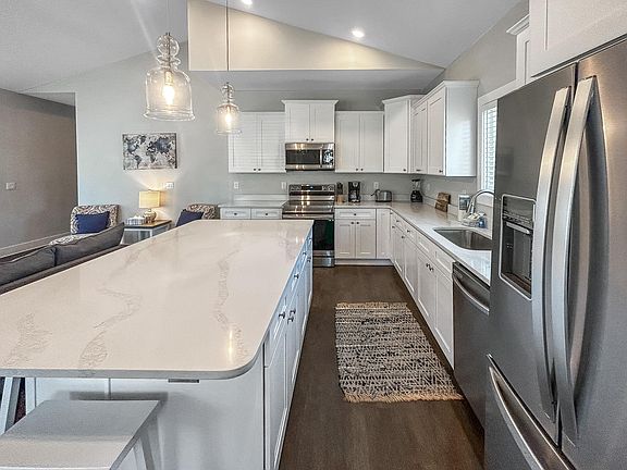 Large windowsContemporary fixturesEnsuite bathroomGenerously sized quartz islandOpen floor planCovered back patioVaulted ceilings