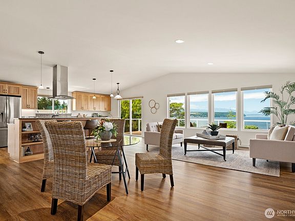 Stunning westerly views of the sound, mountains & gorgeous sunsets in this highly coveted location. Spacious great room with cozy fireplace opens to a large deck designed to take in the beauty. This lovingly upgraded home has two rooms & full bath on one side of the house, plus two rooms & full bath on other side of house - so many possibilities! Primary bath includes a roll in shower, Toto & deep soaking tub. Convection heaters, mini-splits & radiant floor heating were thoughtful energy-efficient upgrades. And what a fantastic kitchen in the heart of the home, with elegant red birch cabinetry, tons of storage. Cape George amenities inc. gym, private beach, boat launch, pickleball, activities. This home is a gem!