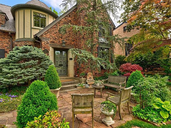 Everyone's Favorite Edgemere House! Nestled behind majestic trees and lush landscape sits this enchanting cottage right out of a storybook! Downstairs is a wonderful entertaining space. The open dining area in the heart of the home, is surrounded by a wood paneled den and living room, both with gas fireplaces, bookcases and hardwood floors. There is also a full powder bath. The kitchen is a chef's dream with a Thermador range with a grill, Bosch double ovens, Subzero refrigerator and an expansive island. The sunroom french doors open to a beautiful backyard flagstone patio, perfect for entertaining by the warmth of the flagstone fireplace. Upstairs are 3 bedrooms, all with original hardwood floors, and 2 baths with Dornbracht fixtures. The primary bedroom is a European style suite featuring a fireplace with gas logs.