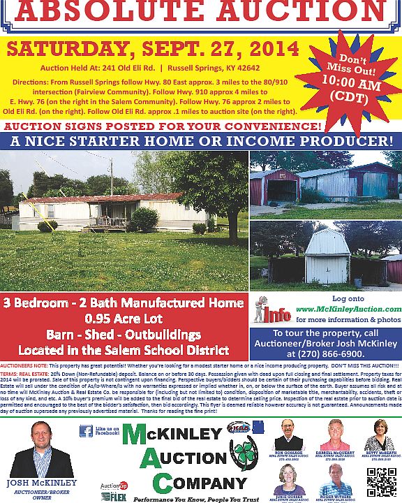 ABSOLUTE AUCTION!!! Saturday Sept. 27th @ 10:00 am cdt 3 bedroom, 2 bath home, on 0.95 ac. lot 241 OLD ELI RD. RUSSELL SPRINGS, KY, BARN/SHEDS ON THE PROPERTY FOR MORE INFORMATION LOG ONTO www.McKinleyAuction.com or call selling agents @ 270-866-6900