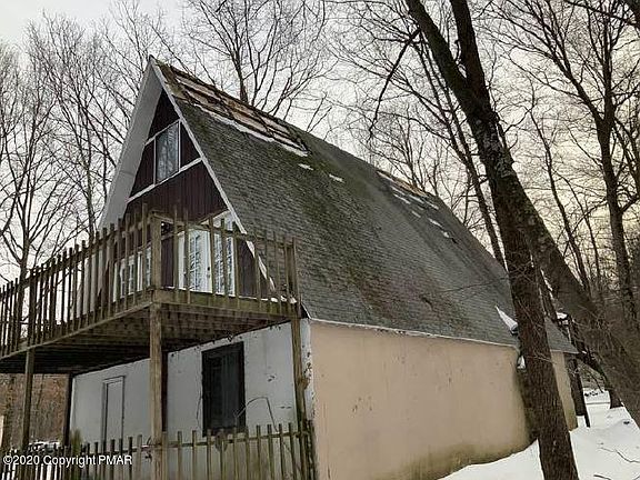 Chalet Style home in Cresco PA, the major fixer is nestled in the woods, unique in design, upper and lower deck, hardwood flooring thru-out, bring your contractor to see if you can being this one back to life. Built in 1971, has 3 bedrooms and 2 bathroom, 2 fireplaces, with an estimated 1296 sq ft of livable space.