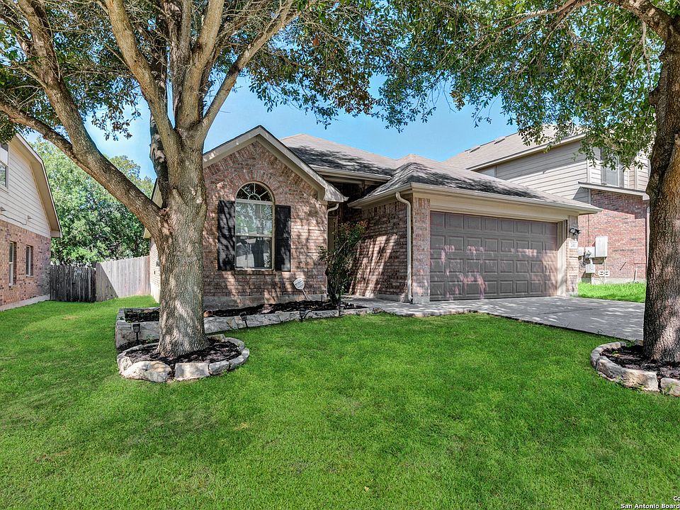 Lovely, low maintenance 4 side brick one story home located behind a large city park, very quiet. Fresh carpet and paint throughout. Open floor plan with large family room that overlooks the covered back patio and TREX deck with the city park view. Split master suite with double vanity bath, separate shower and garden tub plus a large walk-in closet. Two secondary bedrooms share the second bathroom. The spacious kitchen with breakfast bar separates the dining room from the family room with hand-scraped hardwood floor. Two car attached garage plus partially decked attic for storage. SCUC ISD schools, easy access to Steele HS, HEB, retail, restaurants and city park. Two neighborhood parks within Cibolo Valley Ranch. New roof installed June 2024.