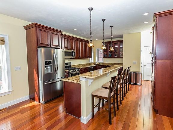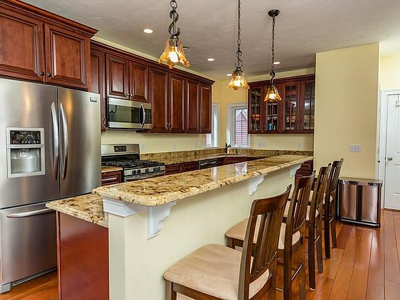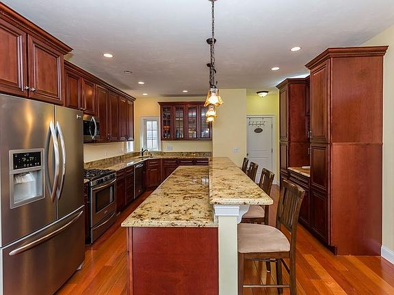 This better than new, younger Colonial style home is located on Brockton's West Side and offers over 3,300 square feet of livable space over three levels. The first floor offers a custom kitchen with cherry cabinets, a large breakfast bar/island, a dining area overlooking the outside patio, granite counters, stainless steel appliances, and a butler's pantry. Other first floor features include a large open family room with gas fireplace, a formal dining room, and a half bath. The second level boost three large bedrooms, including two master suites with huge walk in closets (one with an additional shoe closet), two full bathrooms with double sinks and jetted tubs, and a laundry room. The finished lower level offers a fourth bedroom, an additional family room with a wet bar, a full bathroom, an office, and a storage room. Property upgrades include hardwood flooring throughout, crown moldings, recessed lighting, an attached two car garage, irrigation system, and storage.