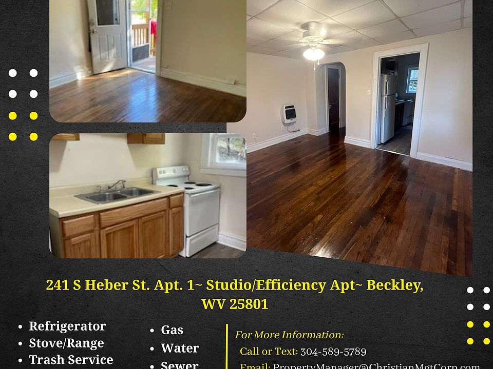 This freshly painted beautiful studio apartment (bedroom and living room is one combined area) features refinished hardwood floors, luxury vinyl plank flooring in the kitchen and bathroom, tub and shower combo, and full size kitchen. The monthly rent includes water, sewer, gas, trash service, and lawn care, the resident just covers electric! Located at 241 S Heber Street in the heart of Uptown Beckley, located within walking distance to banking, shopping, WVU Tech and more, with a new landlord renovating and revitalizing your new home!