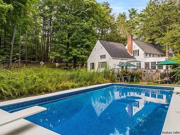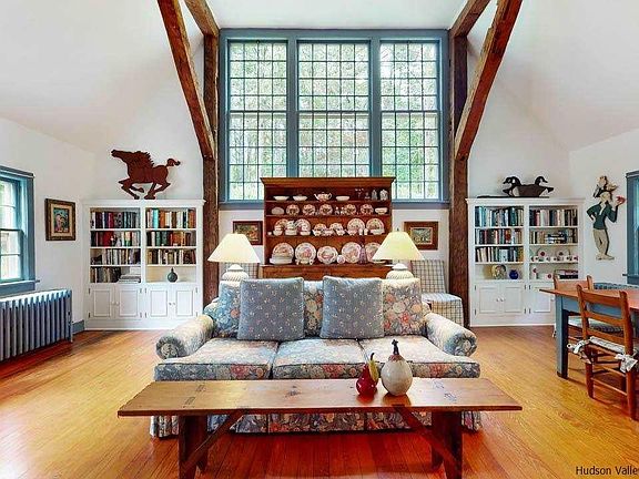 A rare opportunity to own a large Upper Byrdcliffe home in one of Woodstock's most historic and sought-after areas. Plenty of space (4 or 5 bedrooms, 4 full bathrooms, a great room plus additional den) with charm, character, and a wonderful location only a mile to Woodstock Village. Originally the art studio and home of Frank Swift Chase, one of the early settlers of the Byrdcliffe Colony and founder of the Woodstock Artists Association, this impeccable classic colonial farmhouse is full of surprises. From the massive great room with beamed high ceilings and windows everywhere, to the cozy living room - each with a Rumford fireplace - one can sense the history and legacy of Woodstock's artistic heritage. A beautiful four-season sunroom with bluestone floor and a first-floor primary suite both spill out to extensive decks leading to the in-ground pool. Back inside, the sunny galley kitchen hosts a breakfast area on one end and additional room on the other end for a dining table, extended pantry or home office (which is how it is currently configured). Meander upstairs to find 3 more bedrooms and 2 more full baths, all just loaded with charm! Nooks, crannies, window seats, and original hardware abound everywhere. The main-level master suite was added in 2004 and carefully designed and executed to maintain the original character of the home. It looks, from the outside and inside, to have always been there. Custom made built-ins and closets were mindfully created with hardware closely resembling the 100-year-old originals throughout the rest of the home. There is an additional room on the main level which can be used as an office, nursery, den or more guest space. It adjoins a second full bathroom on the first floor. The sellers have lived here for 30+ years and have maintained the property meticulously with all systems in tip-top shape and ready for the next owners' enjoyment. As for the neighborhood, it doesn't get any better than this one! Tucked away from the main thoroughfare, Upper Byrdcliffe is home to weekenders and full time residents including many artists, musicians and writers from all walks of life, some of whom are on temporary internships through the Byrdcliffe Arts Colony. A walker's paradise, one can take in the sounds and sights of nature and even take a guided hiking tour of Mt. Guardian. Nearby are the Byrdcliffe Theatre and famed ceramics studio where one can take classes and see performances in the summer months. A short ride or stroll in either direction to Sunfrost or Woodstock Village for food, restaurants, shops, galleries, music and theatre. Hiking everywhere and skiing or water activities all within 30 minutes.