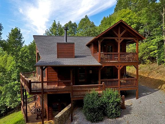 A WATERFALL & Mountain VIEW BOTH... in ONE PROPERTY !!! WHAT A FIND ! This Cabin is impressive the moment you drive up - Prow Front w/Unique "Rustic" Accents in Cabinetry & AdirondackTrim. 3 Bdrm + OPEN Loft. Exterior Party Porch w/ROCK Wood-Burning Fireplace....overlooking a Boulder Staircase to Small Pool at the Base of STONE WATERFALL. Granite Countertops/Laurel Branch Pickets AND AMAZING Long Range Mountain Views.Dual Vanities in Main/Upper Bath.