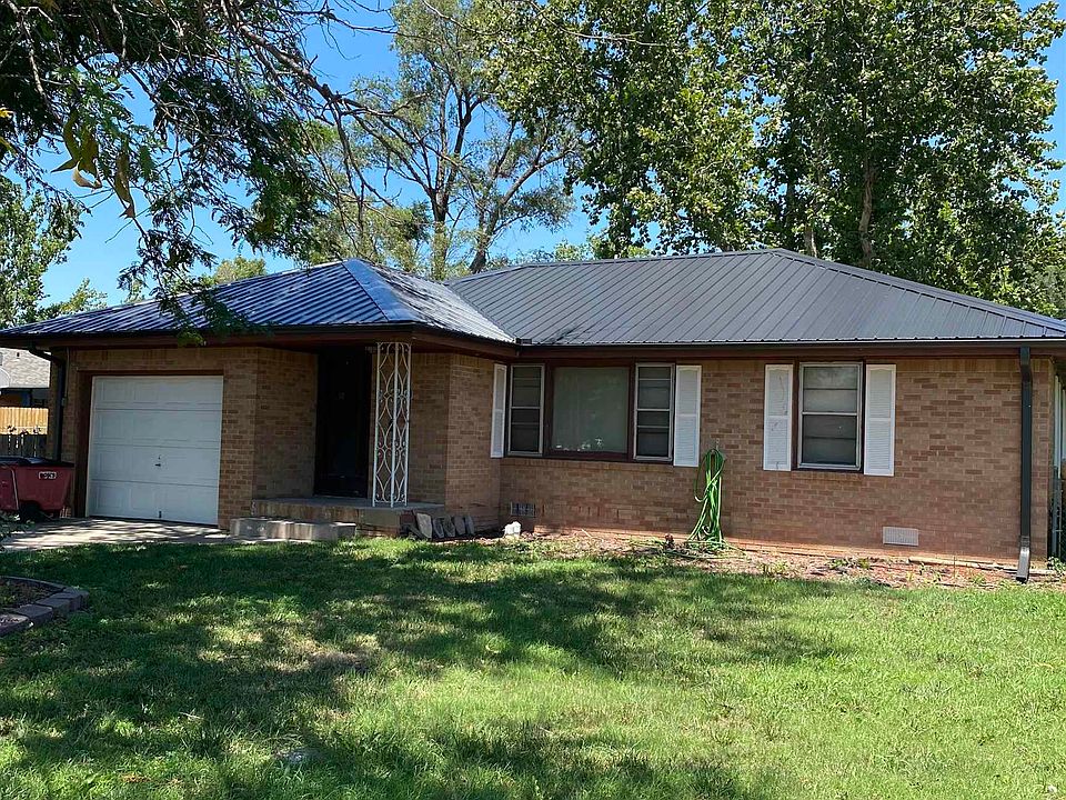 Under Contract ~ Subject to inspections ~ continue to show. Brick ranch with new metal roof, almost 1500 sq. ft., all hard surface flooring. Spacious living room, 2 bedrooms plus optional 3rd bedroom, family room or den, large eat in kitchen. 1 1/2 baths, 1/2 bath combined with utility & mechanical room. Single attached garage has been converted for additional bedroom & storage, but could be changed back to garage. Patio, storage shed in chain link fenced back yard. Property is selling "AS IS"...