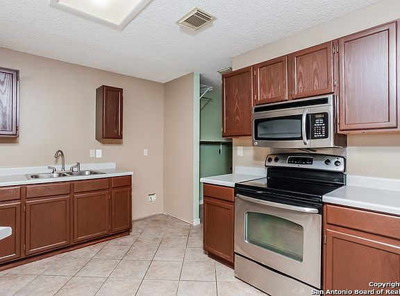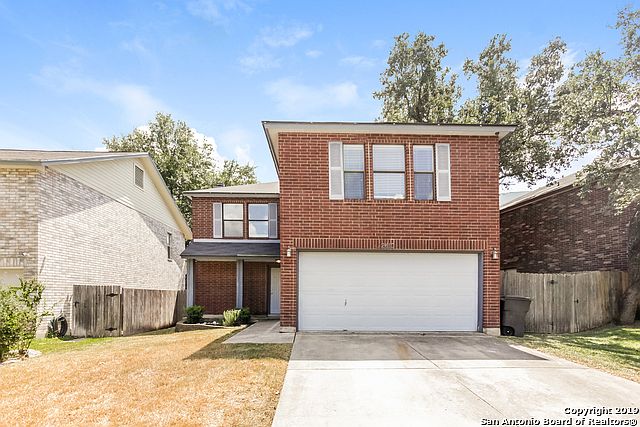 This San Antonio two-story home offers a wood-burning fireplace, stainless steel appliances, a patio, and a two-car garage.