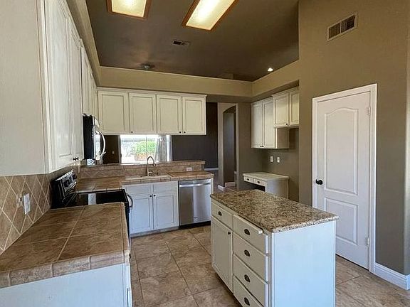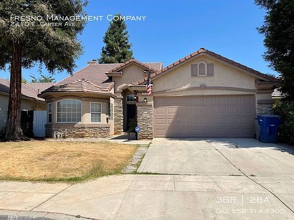 This adorable single story home located within walking distance to Clovis North High School featuring 3 bedrooms and 2 bathrooms. As you enter the home you are greeted by lovely tile flooring and an open floor plan with vaulted ceilings, duel ceiling fans, two tone paint, recessed lighting. The kitchen and bathrooms have been upgraded to tile, newer cabinets nd granite countertop island in the kitchen. The master bath has a nicely tiled, large step down Tub-shower, walk closet and duel sinks vanity area. Built in cabinets in the hallway for extra storage space. The backyard includes a nice size covered patio area with two separate sliding glass doors leading to it. Call for your showing today. BOOK A TOUR. DRE#01930950. Carpet In Bedrooms. Carpet In Living Room. Central Ac. Electric Stove. Garage. Gated Back Yard. Single Level. Washer Dryer Hookups