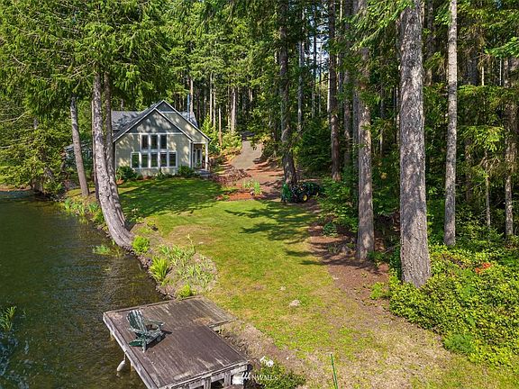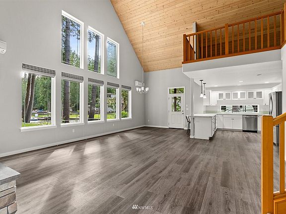 Welcome to the lake. Stunning waterfront home sits on nearly an acre w/115 ft of waterfront, nestled in the cove of Phillips Lake. Open concept living w/beautiful wood finishes,vaulted ceilings, large bay windows allowing endless natural light & a perfect lake view. Modern style with bright finishes & wood burning stove, giving you the cozy cabin feel. Primary bedroom on the main w/a large bathroom & walk in closet. Secondary bedroom features a/private deck. Loft overlooking the main living area w/panoramic views of the lake. Den on the upper level(could be a 3rd bed). Entertain or relax in your huge park like yard, or 1 of 2 private docks. RV parking, 2 driveways, 2 car detached garage w/fully insulated workshop.Ski, boat, fish & swim!