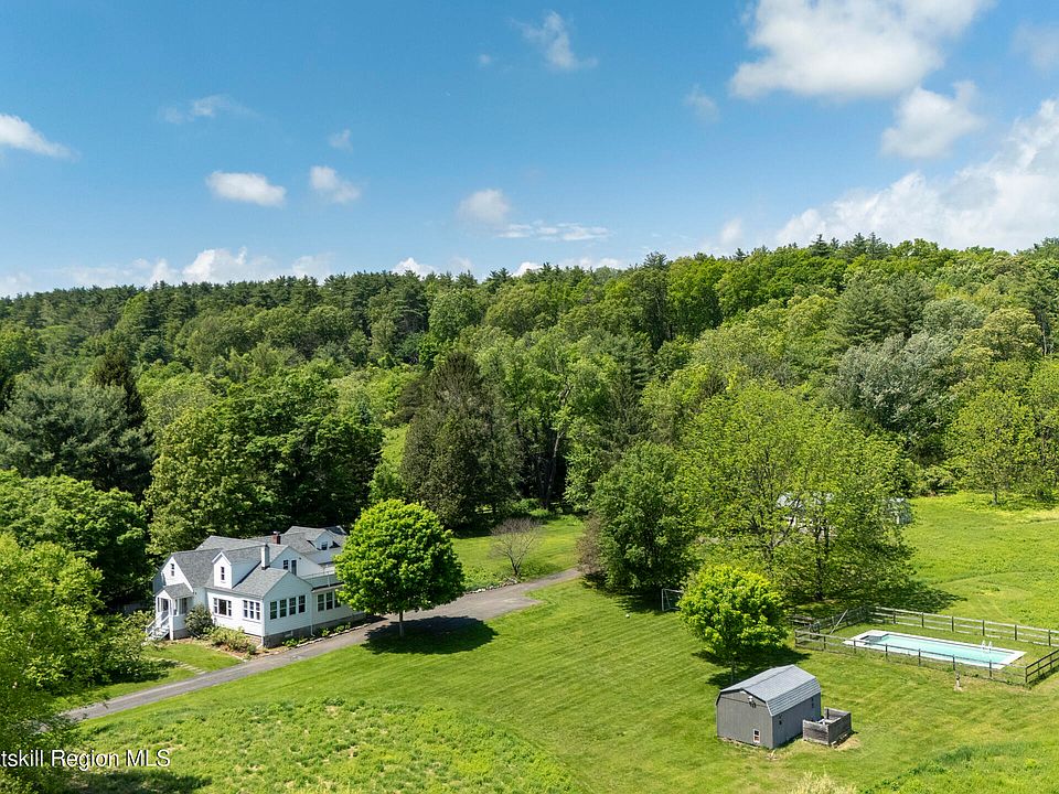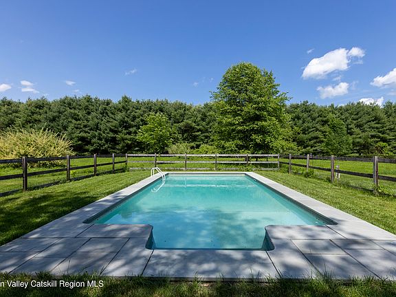 tucked away on nearly 9 acres of beautifully maintained land. This turnkey, home offers a rare combination of privacy, space, and comfort. Set back on a quiet country road- just minutes from the vibrant communities of Kingston, Stone Ridge and Woodstock- you'll enjoy peaceful seclusion with convenient access to fine dining, shopping and local amenities. Flooded with natural light, the home is thoughtfully designed for both relaxed living and entertaining. The spacious living room, anchored by a wood-burning stove, invites cozy gatherings, while the heated saltwater pool provides a luxurious escape on summer days. A separate guest wing features two bedrooms and a beautifully tiled full bathroom, perfect for hosting friends or creating a private work-from-home sanctuary, while flexible spaces across both floors offer options for additional bedrooms, home offices or creative studios. Recent upgrades include, but are not limited to, fully remodeled kitchen and bathrooms, newer roofs on all structures, a new septic tank, on-demand whole house water heater, and hardwiring for a generator. Multiple outbuildings include a three-car garage, and large sheds. Outside the property is a nature lover's dream, mature specimen trees, wildflower meadows and mowed walking paths create a peaceful setting that transforms with the seasons. Whether your sipping morning coffee under the trees or enjoying an evening stroll, this landscape invites you to unwind.