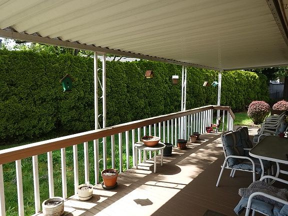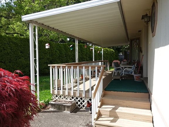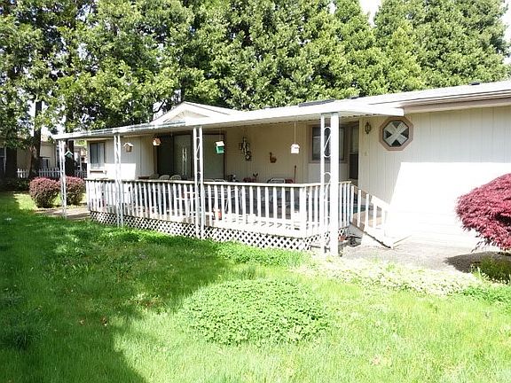 Amazing 1990 home with vaulted ceilings in bright and sunny living room, large kitchen with island open to family room with bay window. Two large bedroom suites. Amazing large private lot backs up to row of lovely fir trees. Double carport with 8x13 storage shed. Off street parking for four cars. Large covered entry porch. Park offers two rec centers, and indoor pool, and garbage service.