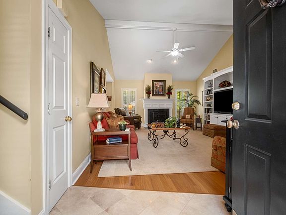 This beautiful home offers an inviting and spacious living room, complete with built-ins and a cozy gas log fireplace, perfect for relaxing or entertaining. The kitchen is a chef’s dream, featuring elegant granite countertops, stainless steel appliances, and a convenient counter-height bar. Enjoy meals in the breakfast area or step outside to the serene screened porch for a relaxing moment. The primary suite is a true retreat; featuring a trey ceiling, ensuite bathroom with a double vanity and a beautifully tiled shower, creating a spa-like atmosphere. There's a gorgeous guest bedroom with a bay window allowing wonderful natural light. A thoughtfully designed drop zone with built-ins and a lovely bench seating area provides a perfect place for everyday organization. Throughout the home; plantation shutters adorn the windows, hardwood floors add warmth and character. Outside, the large corner lot features a park-like backyard with mature trees and lush, well-maintained grass – the ideal setting for outdoor activities or peaceful relaxation.