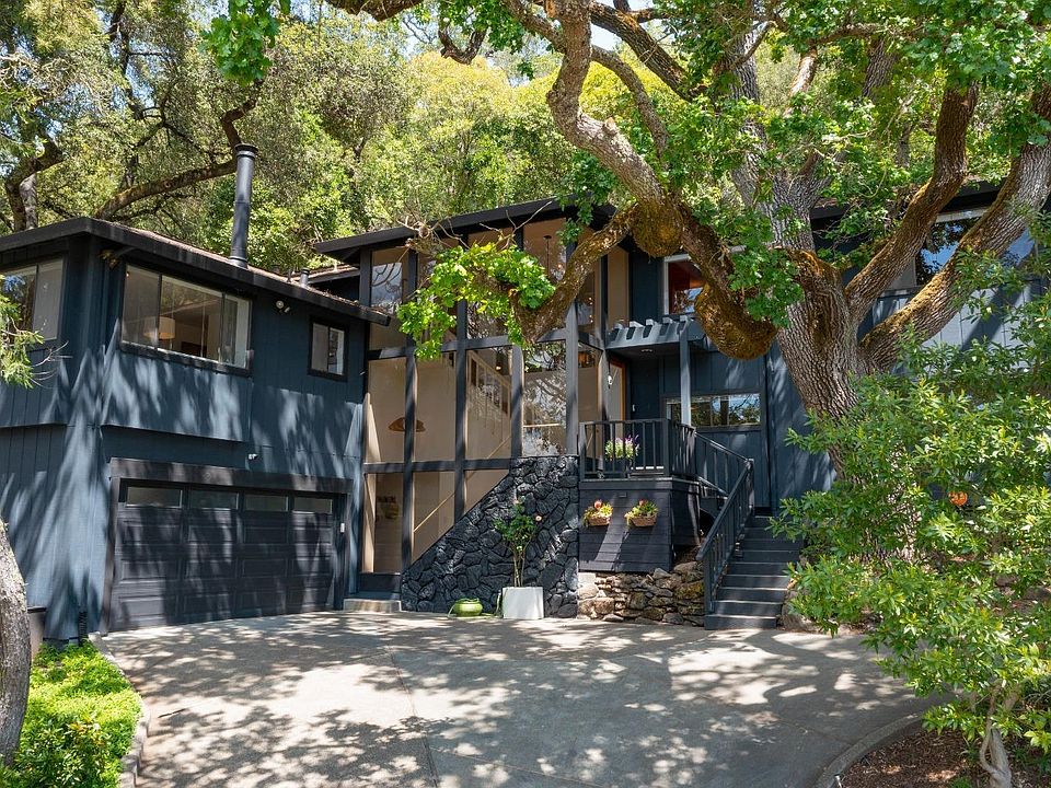 Stunning contemporary home with a lovely glass entrance and light filled spaces! This 3 bed, 3 bath home has been beautifully updated to compliment the style and design of the home. The newly renovated kitchen features custom tile, modern cabinets and a large walnut peninsula, providing plenty of room for entertaining. The kitchen is open to the family room which opens to the outdoors, a wood burning fireplace adds to the charm of this room. The living room is spacious and boasts a fireplace, skylight and numerous windows providing a lovely view of the backyard. Newly installed birch hardwood floors provide warmth for the living spaces. The primary suite is secluded and offers views and light along with a sitting area and wood burning stove. The lower level, with a separate entrance, features a large bonus space; the perfect spot for a Jr. ADU, art studio, music room or office. A full bath, countertop with storage and a laundry room can all be easily accessed from this area. Updated electric is an added bonus! Situated on +/- 1/2 acre, enjoy the majestic oak trees, native plantings and carefully selected flowering shrubs that enhance the front and back gardens. Located in the coveted Hidden Valley Neighborhood, this property is the perfect place to call home!