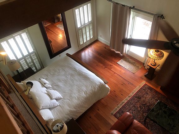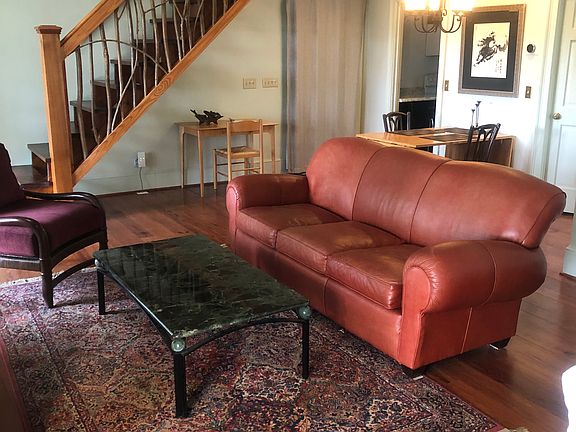 Separated from the main house, this stand-alone cottage affords privacy and comfort in a wooded setting. Private entrance and private parking. With two porches (one open, one glass enclosed) and separate parking near the entry, pool access and scenic views this is more of a retreat than an apartment. Lots of windows, storage and open space, a loft and vaulted ceilings .