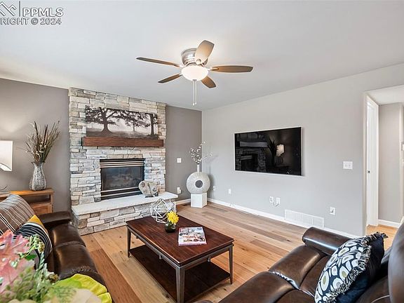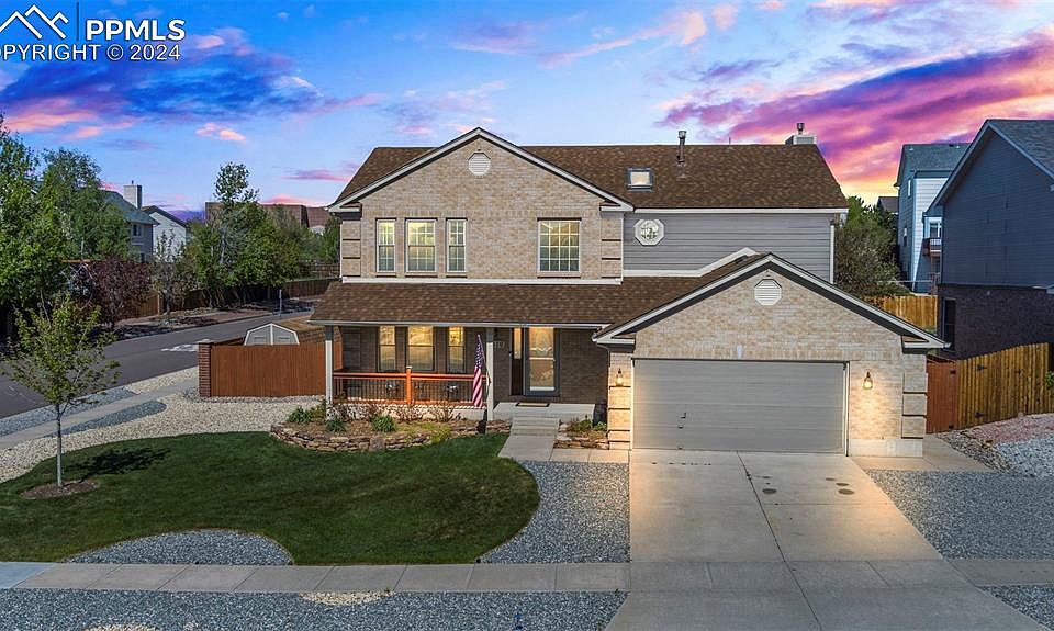 Summerfield Home in prestigious D20 and International Baccalaureate schooling neighborhood. The front porch invites you to rest and relax as you take in the gorgeous mountain views. Home is freshly painted with contemporary colors, brand new flooring, renovated kitchen and bathrooms, and includes A/C and 2 ½ car garage. The front living room and Master Bedroom enjoy front range views, including Pikes Peak. The main level includes a formal living room, dining area, family room with stone to ceiling gas fireplace open to the remodeled kitchen and back yard, laundry and half bath. Chefs will love this kitchen with gorgeous granite counters, white painted cabinets, large island, stainless steel appliances, stone sink overlooking the backyard, and contemporary wood plank floors. As you explore upstairs you will find modern stair balusters, massive master suite with attached 5 piece bath completely remodeled with frameless glass shower, granite counter dual vanities, gorgeous modern tile in the shower and flooring and updated light fixtures. Three additional large bedrooms with oversized closets and another remodeled full bathroom with skylight complete this level. As you walk downstairs, pause at the top of the stairs to say “Hello!” to Pikes Peak! Then, get ready to DREAM with over 1,100 sqft of unfinished space. SOO Many Possibilities! The oversized, fully fenced backyard includes a large shed and huge patio for entertaining all your friends for backyard barbeques. The roof has Class 4 shingles. Ideally located less than a block from the Skyway Trail system, across the Park from Lulu Pollard Park, and 1 block to Mountain Ridge Middle School. Nearby volleyball court, state of the art John Venezia Park with splashpad, tennis courts & MORE! Minutes to Children’s Hospital, Air Force Academy, I-25, Shops at the Promenade, Focus on the Family, Restaurants, Shopping & MORE! NO HOA. See this stunning home TODAY!