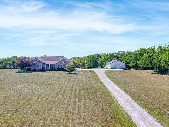 When moving to the country most must make compromises. Either you compromise on quality, location, or price. No compromises are required for this stunning property. The location is perfect for you are only minutes from everything in the city. The house is a stunningly well cared for almost 3200 sf 5 BR 3 BA ranch with a finished walk out basement on almost 5 acres with great views, stocked pond, timber and a 1200 sf metal outbuilding with electricity, concrete floor and pull through doors. Your first reaction will be that the home is new because it has been so well maintained. From gorgeous wood floors to the new plush carpet, roof, furnace, and AC all new since 2021 everything seems new. But it’s the fine details of how this house was designed that you appreciate. From the solar screens on the west side to provide comfort in the heat of the day, to the deep sink in the main floor laundry, to the ADA compliant doors and hallway, to the tilt in windows for easy cleaning, smart thermostat, and many other things too numerous to mention. For those who like to enjoy working on their property there is a workshop in the basement, massive basement storage, and an outbuilding that has enough room for 3 vehicles, an extended cab truck and trailer, a built-in work bench, back up solar power for the shop, plus room for the other toys, mowers and tools. But the real joy is living the country life. Would you like to look out the door to see deer, fox, geese, turkeys, and the occasional eagle? Would you enjoy your stocked pond that explodes in a frenzy when you throw some fish food in? Would you enjoy both sunrise and sunset views while enjoying brilliant starlight nights without interference from city lights? You don’t have to compromise anything. You are moments from the city, on paved roads, have fiber optic internet available and live on the state line for easy access to both sides of the metro. This is the country home you have been dreaming about.